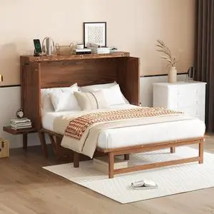 Full Size Murphy Bed with USB Port and Removable Shelves on Each Side, Solid Pine Murphy Cabinet Bed for Home Office, Guest Room,Walnut