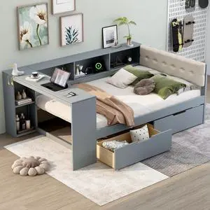 Wood Full Size Platform Bed with Storage Shelves, Drawers, Charging Station and Upholstered Headboard, Gray