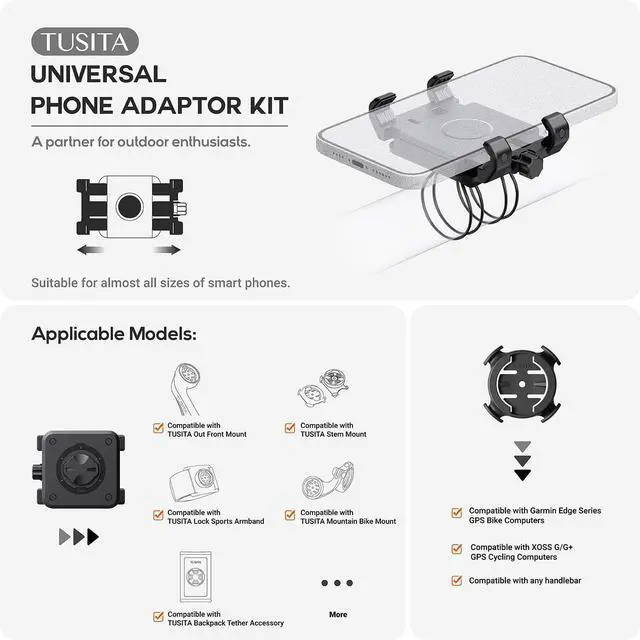 The TUSITA Bicycle Phone Holder offers broad compatibility, accommodating smartphones with screen sizes ranging from 4.0" to 6.9". It seamlessly integrates with all Garmin bike GPS mounts featuring a Garmin base. Equipped with this phone holder, riders can effortlessly capture photos or videos while cycling.
