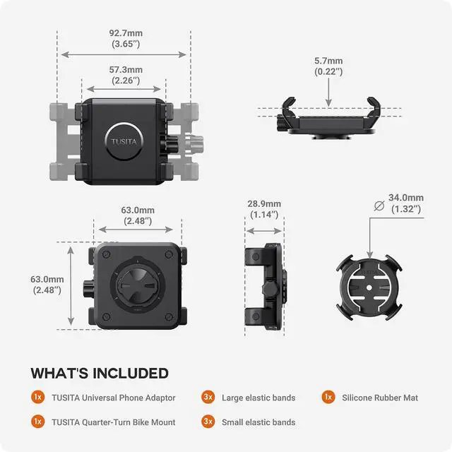 1 x TUSITA Bike Phone Holder, 1 x Quarter Turn Mount , 1 x Silicone Rubber Mat, 3 x Large Elastic Bands, 3 x Small Elastic Bands