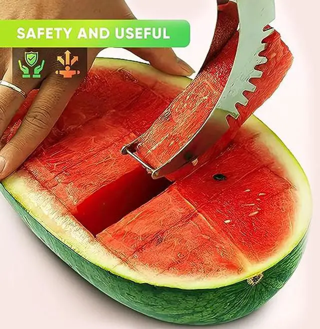 TV Direct - Melon Slicing Tool Serve Slice or Cubes Ease Kitchen Gadget. The Melon Slicing Tool features a durable and sharp stainless steel blade ensuring clean and smooth cuts through the toughest melon skins. The ergonomic handle provides a comfortable grip allowing for precise control and minimizing the risk of accidents or slips during use. With this set of two slicing tools you have everything you need to tackle different melon sizes and varieties. The larger slicer is ideal for larger melons like watermelons or cantaloupes while the smaller slicer is perfect for medium-sized fruits such as honeydews or personal-sized watermelons.
