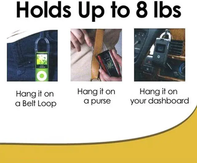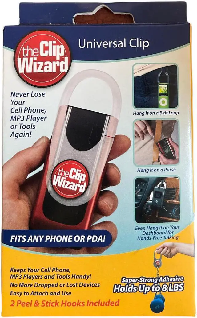 Never lose your cell phone MP3 player or tools again with the universal Clip Wizard. Fits any phone or PDA. Each clip contains adhesive that can hold up to 8lbs. Great for hands-free cell phone operation just hang it on the dashboard for hands free talking.