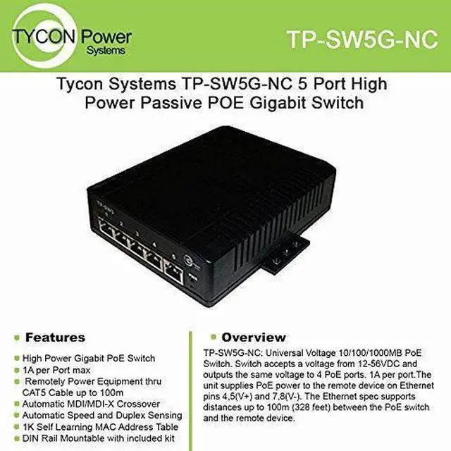 TP-SW5G-NC: Universal Voltage 10/100/1000MB PoE Switch. Switch accepts a voltage from 12-56VDC and outputs the same voltage to 4 PoE ports. 1A per port.