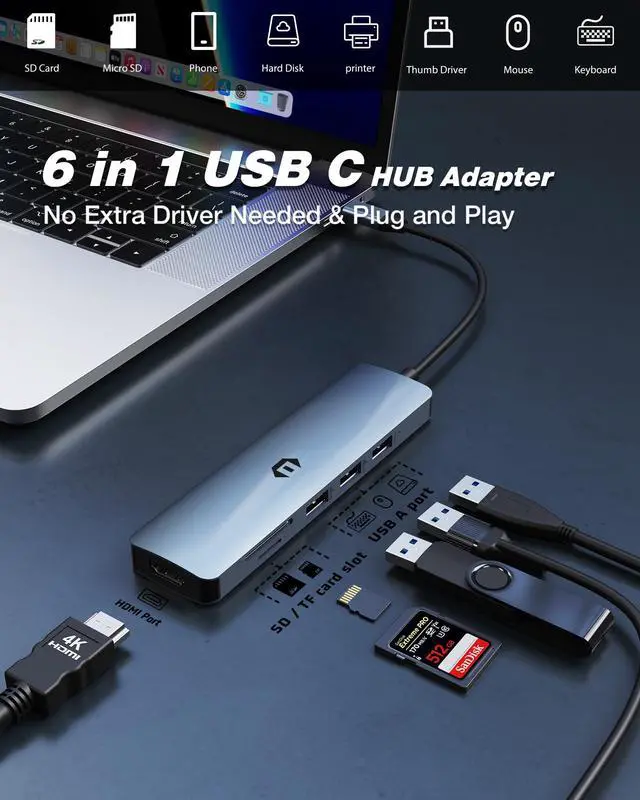 Tymyp 7 IN 1 USB C Classic Hub, USB 3.0, 4K HDMI and SD/TF