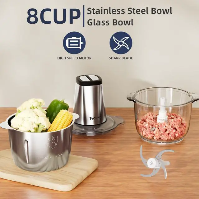 Two BowlsThis Food chopper with container contains with two different materials bowls accessories, 8 cup stainless steel bowl and 8 cup glass bowl. You can process the meat and vegetables separately to avoid confusion between bowls for different uses. This meat chopper for ground beef can make your food process healthier and more hygienic
