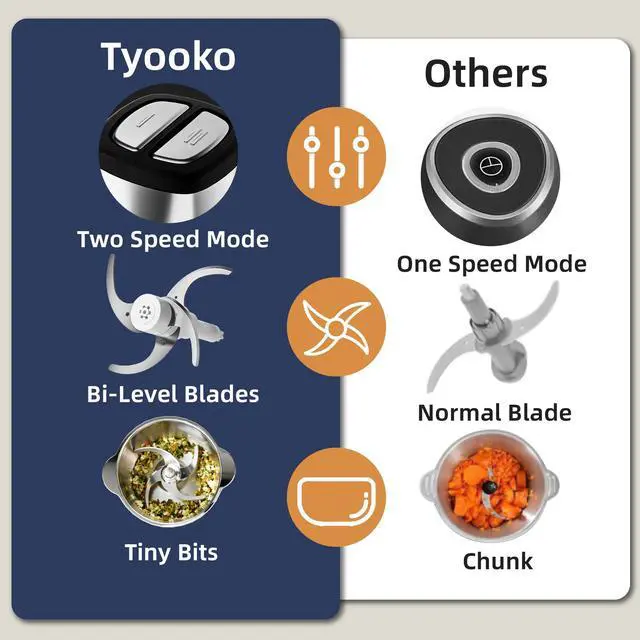 Powerful & SafeThis small food processor comes with full-copper motor to ensure that hard foods also can be processed completely into tiny bits. Food-Grade materials certified BPA-free ensuring safe and healthy food processing for your family. Additionally, this electric chopper built-in with safety lock, align the motor shaft core with the blade interface, motor work only when the arrow of the motor align to the lid arrow. Blades halt instantly when the motor is disengaged