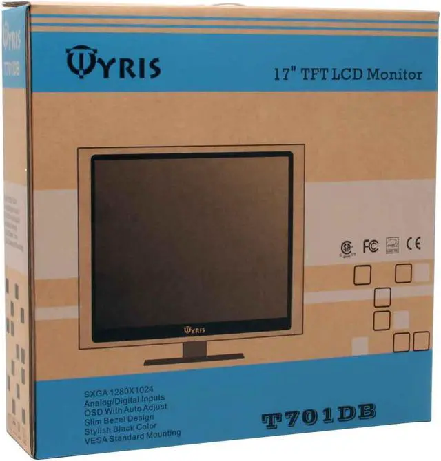 Look no further than the Tyris T701DB if you plan on upgrading your display to a 17" LCD monitor! The high brightness, excellent contrast ratio and 8ms response deliver beautiful color reproduction and crisp text. Wrapped in a polished black bezel, this monitor boasts both Analog and DVI ports and is wall mountable. For your security, it is Kensington lock ready, and has a one year limited warranty.