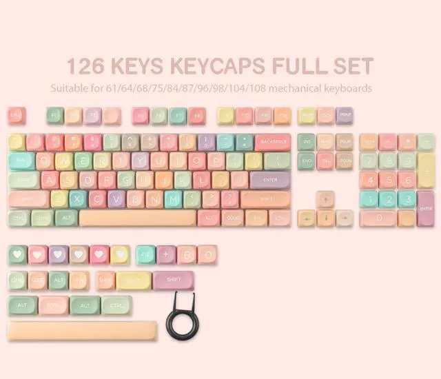 126 keys keycaps can be used for most cherry MX switch mechanical keyboards and any keys with "+"Switches, a good choice for you to custom your mechanical keyboard. 126 keys can fit for 61/64/68/75/84/87/96/98/104/108 mechanical keyboard.