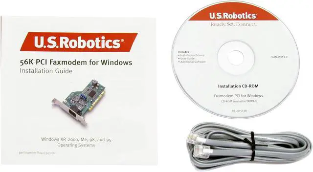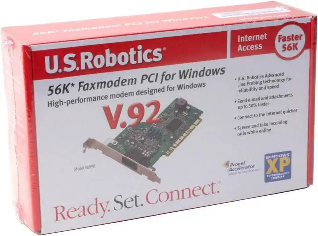 | Features | Send e-mail and attachments faster Get online quicker Don’t miss that important phone call Exclusive U.S. Robotics Control Center Renowned U.S. Robotics performance Software upgradeable Included software turns your computer into a feature-rich fax machine Simple step-by-step installation |