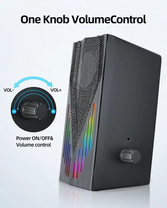 Convenient Handy ControlPC speakers for desktop is equipped with a large round control button. All operations are on one, very convenient.Rotate the button clockwise to volume+ and rotate the button counterclockwiseto volume-.