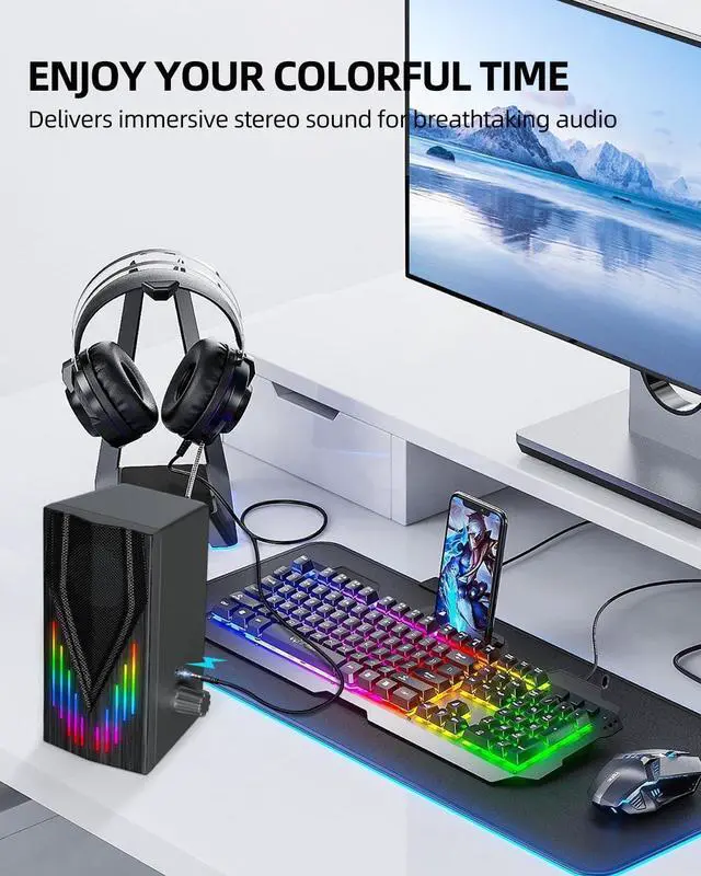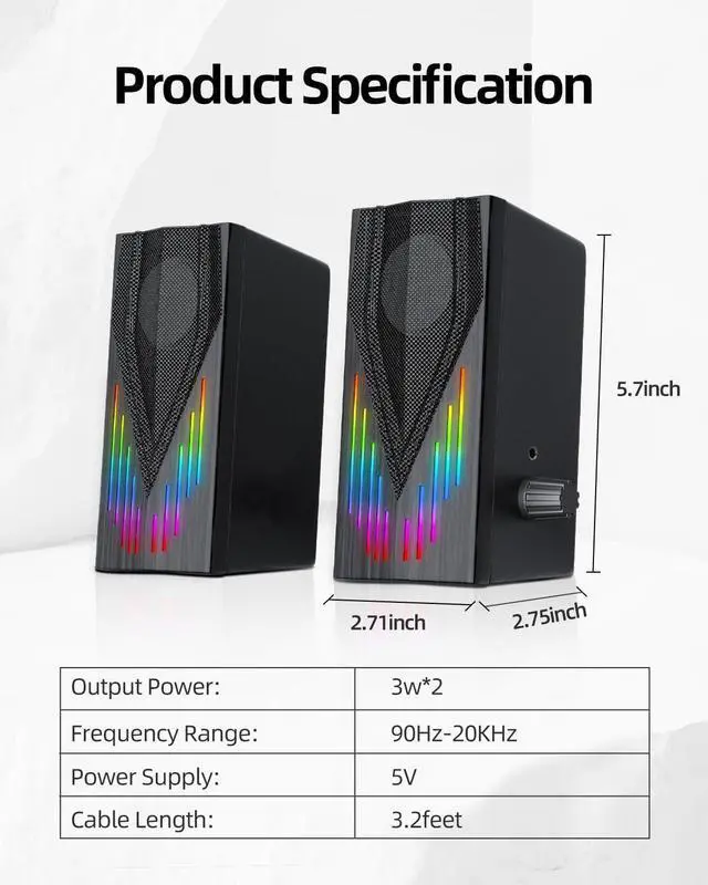 6 LED Lighting EffectsThe speaker adopts LED rainbow light hidden at the bottom. It provides a more attractive lighting atmosphere but protects your eyes when playing games or watching movies. adding a visually captivating dimension to the gaming experience.