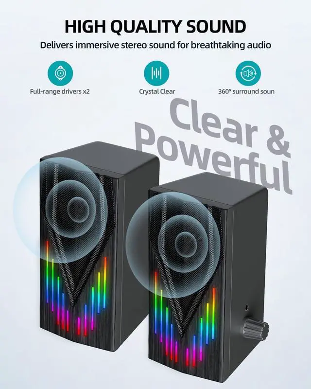 Enhanced Clear BassFeaturing Dual 3W Hi-Sensitive Drivers and dual bass diaphragms, our computer sound bar provides rich high pitch and powerful bass which provide you with enjoyable stereo experience when you enjoying indoor movies, videos, music and games. With immersive stereo sound for breathtaking audio you'll enjoy a crisper, more immersive audio journey.