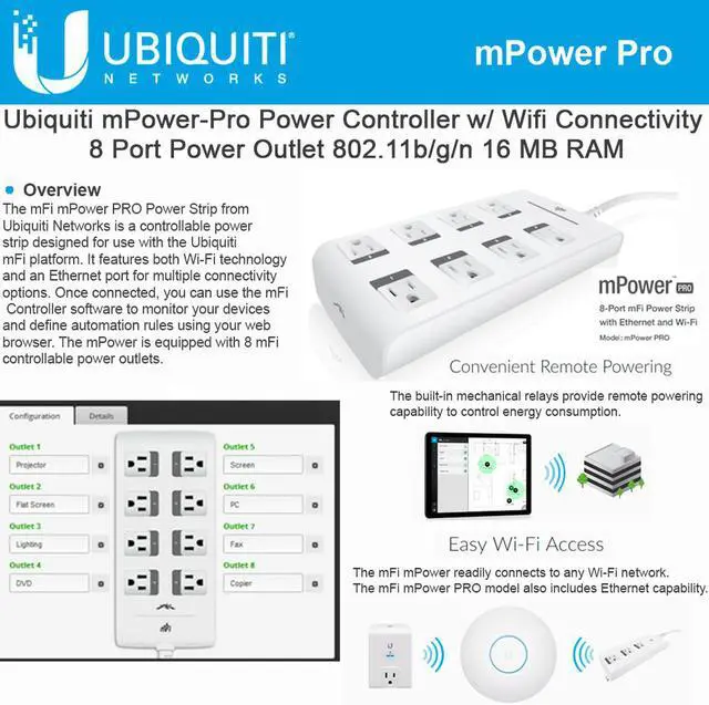 The mFi® mPower readily connects to any Wi-Fi network. The mFi mPower™ PRO model also includes Ethernet capability.