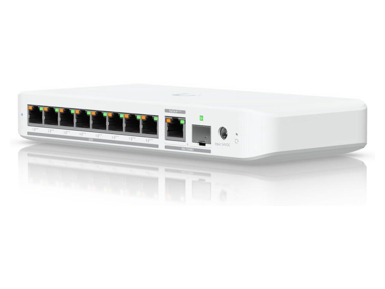 - Flexible, 8-port 2.5 GbE PoE++ switch with a 10 GbE RJ45/SFP+ combination uplink port that can be powered with PoE+++ or an AC power adapter**.