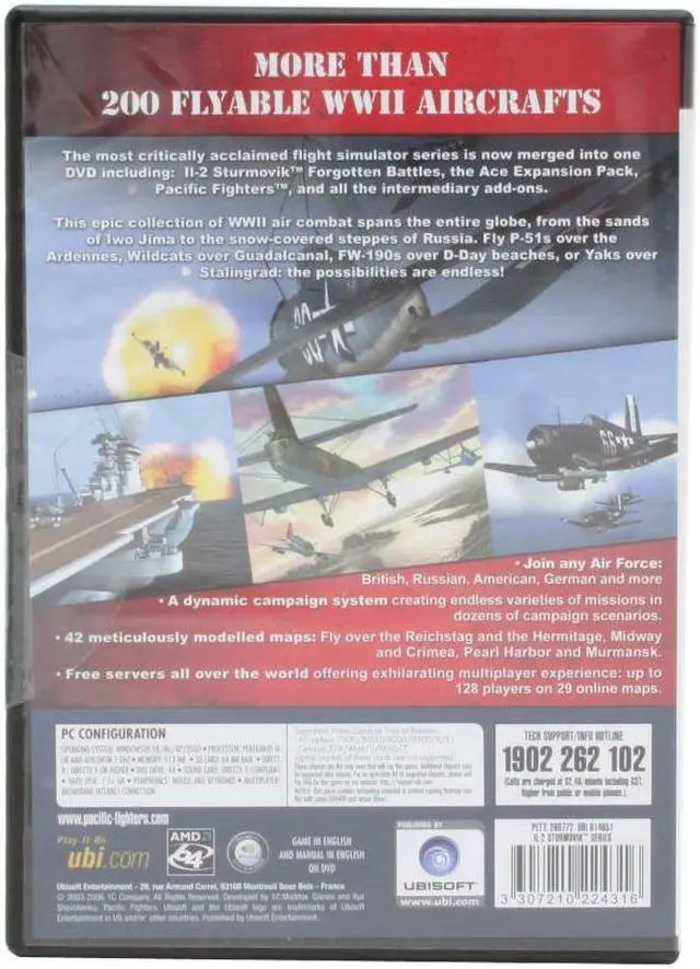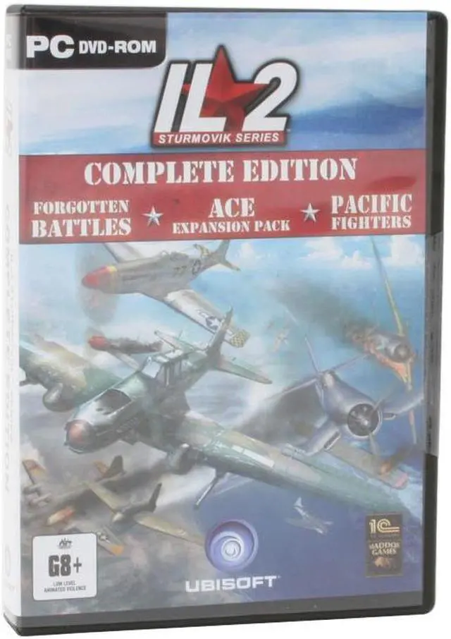 | Features | INCLUDES: IL2 Sturmovik: Forgotten Battles: IL-2 Sturmovik: The Forgotten Battles is a flight simulator from creators of award-winning IL-2 Sturmovik. In addition to the new campaigns set on the Finnish and Hungarian fronts and new single and multiplayer missions, several new playable and AI controlled Russian, German and British aircraft will be featured in IL-2 Sturmovik: The Forgotten Battles. IL2 Sturmovik: Forgotten Battles Ace Expasion Pack: Touted as the most realistic WWII flight simulation game to date, IL-2: Forgotten Battles soars to new heights with this exhilarating expansion pack. Adding 20 authentic new aircraft, three never-explored environments, and 30 demading new missions, Ace will plunge you deeper than ever into the perilous world of a WWII fighter pilot. Pacific Fighters: The award-winning flight combat from Oleg Maddox's IL-2 series moves the setting from the Eastern front to the fierce combat of the Pacific theater. Allied fighters and bombers square off against the notorious air power of the Japanese empire. For the first time, a large variety of British aircraft will be included along with U.S. and Australian planes. Target enemy ships, vehicles, airfields, and a host of AI-controlled aircraft. Re-enact some of the most famous air battles of WWII in places like Pearl Harbor, Guadalcanal, and Iwo Jima. |