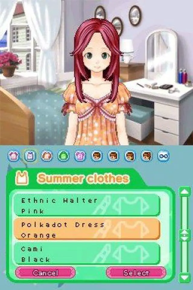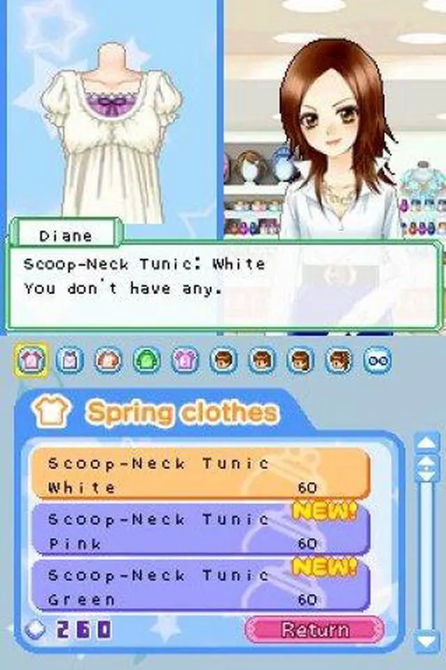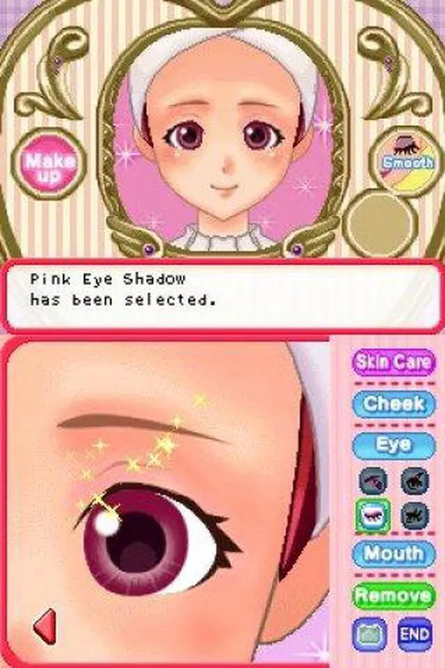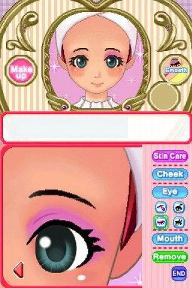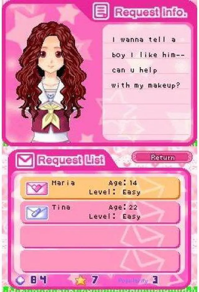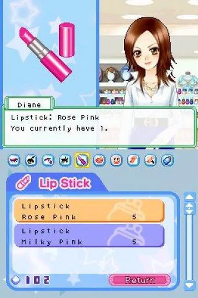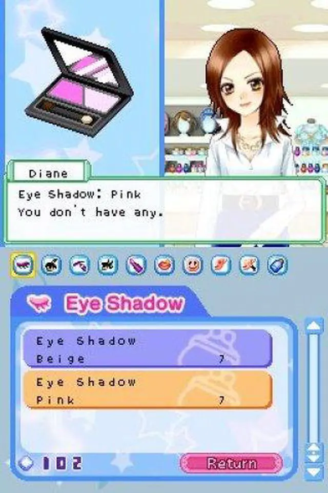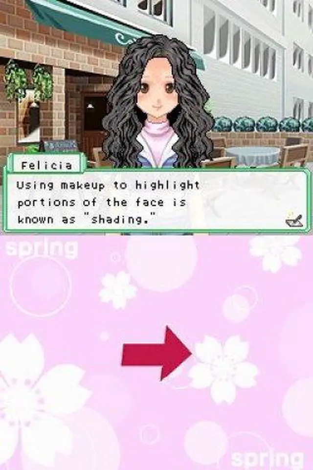 | Features | Become an aspiring makeup artist! Start as an amateur and train yourself in different makeup techniques. Make your clients happy and beautiful by catering to their needs. Research the perfect looks, participate in contests and build your reputation as a professional makeup artist! Use the Nintendo DS stylus to apply makeup, including foundation, lipstick, eye shadow, blush and more! Receive requests from clients for particular makeup looks and then hit the town to ask friends and experts for advice on how to best achieve those looks. Play fun mini-games to earn money and go shopping for clothes, hairstyles, accessories, makeup and more! Practice your new makeup techniques on your character to get ready for dates. Share items with your friends or play mini-games with them via DS wireless communications. |