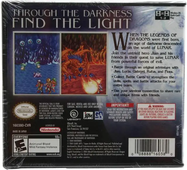 | Features | Gamearts and Japan Art Media have brought the classic Lunar series back to life on the DS. The game takes place 1,000 year prior to the original Lunar as Jian and his fellow adventurers set off on an adventure. The battle system is turn-based and makes use of the dual screens to allow for tall views of the battle field. In addition to the main storyline, you can take part in a card battle game against a friend using the DS's wireless support. |