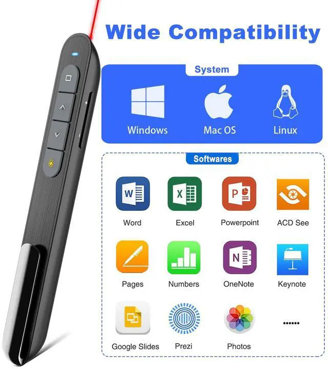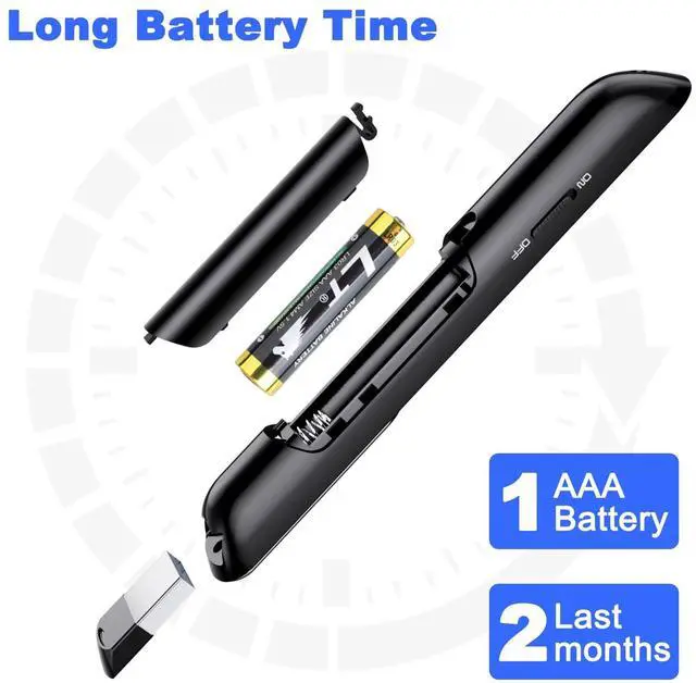 UBUYONE Wireless Presenter pen Support Hyperlink Compact and delicate wireless presenter demonstrator, it has the advantages of portable, beautiful appearance, simple operation, etc., which is the best choice for gift and self-use. Specifications£º # Battery: 1pcs AAA Battery (Not included) # Presenter pen£º139 * 19 * 19.6 mm 5.47*0.74*0.49 in #USB Wireless receiver: 27.5 * 13 * 5.6 mm 1.08*0.5*0.22in # Output Power: Less than 5mw # Distance: > 100m # Working Voltage: 1.5V # Wavelength: 650nm # Color: red # Material: ABS # Color: Black # Weight: 25g # Wireless Presenter Control Distance: 50feet (The effective distance will change with the surrounding environment) Package listing£º # 1¡ÁWireless Presenter Pen # 1¡ÁWireless Receiver # 1¡ÁWarning Sticker # 1¡ÁUser Manual Safety Warning£º # Be warned that 2.4G Hz pointer are not toys, they should never under any circumstances be directed into people¡¯s eyes or at passing aircraft. # The pointer is not a toy and should not used by anyone under 18. # The pointer can be dangerous if not used properly.
