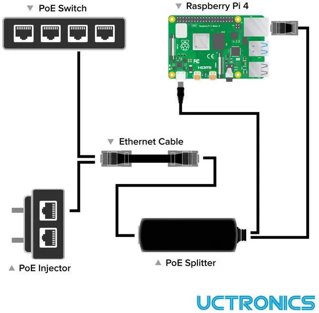 UCTRONICS produces reliable PoE splitters to add Power over Ethernet support to 5V USB-C devices. PoE splitters save USB adapter wall plugs, extend power line to where your Ethernet cable reaches, and make full use of the extra PoE ports by converting them to 5V USB-C power supply. It’s designed for 5V USB-C devices to be powered over Ethernet cables for powerline adaptation or extension. We recommend you use this item with IEEE 802.3af compliant PoE switches or injectors.