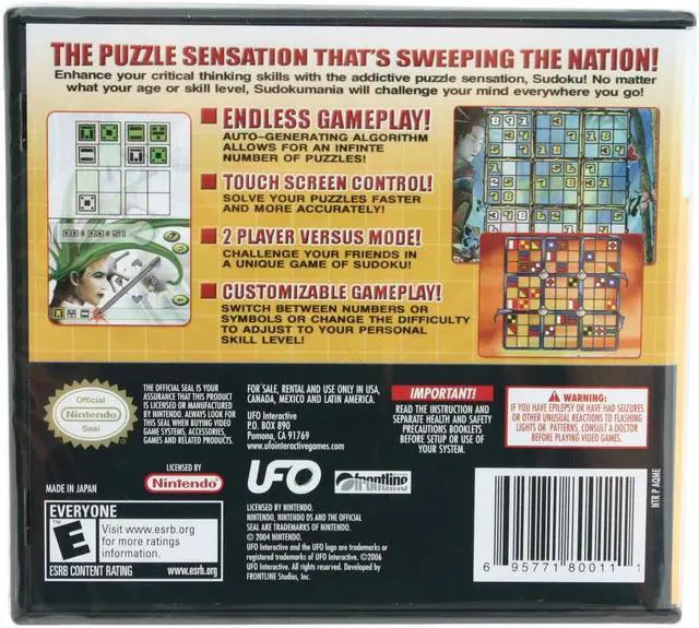 | Features | Portable puzzle fiends can rejoice as the puzzle sensation, Sudoku makes its debut on the Nintendo DS with exclusive features not found on any other console Sudoku game! With its time saving Touch Screen control and infinite number of puzzles this is the version of the classic puzzle game you'll want to take everywhere with you. SUDOKU MANIA Key Features: Auto-generating algorithm allows for an infinite number of puzzles! Time saving Touch Screen control! Unique 2 player versus mode! Customizable difficulty allows you to adjust the game to your personal skill level! Select from 5 different themes and switch between numbers or symbols! Pick up where you left off with the puzzle saving feature! |