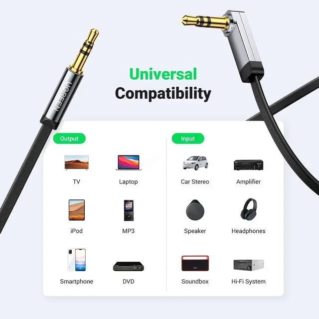 UGREEN Premium 3.5mm Male to Male Audio Cable is compatible with iPods or Media Players to car stereos or speakers. It features for its right angle and ultra slim flat cable, with easy connection and storage. The slim metal case connector allows you to plug it to your source device without taking off your mobile/Tablet case.