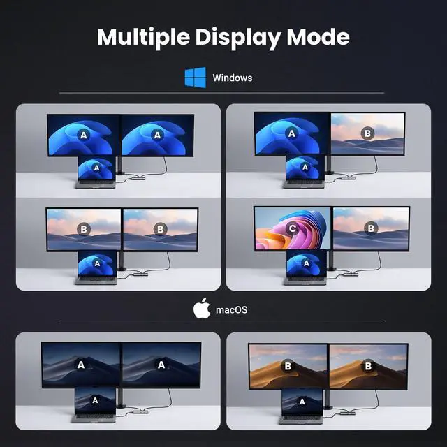 Dual HDMI Display: The Docking Station will hook up two displays to both HDMI ports in 4K@60Hz max, which makes cross-screen multitasking and creative workflows even more efficient. Please note that extended mode is only supported on Windows systems.Due to MacOS limitations, all extended monitors will display the same content when connecting a MacBook.