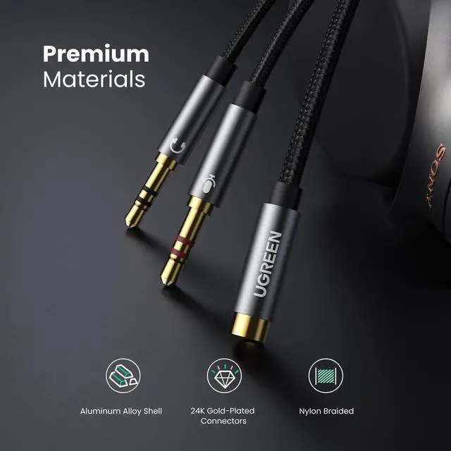 UGREEN audio splitter for headphones splits 1 headset (support audio & microphone) jack into a separate headphone and microphone jack.