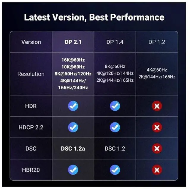 UHBR20 Rating: Significantly increases bandwidth up to 40Gbps and is backward compatible with DisplayPort 1.4/1.3/1.2/1.1