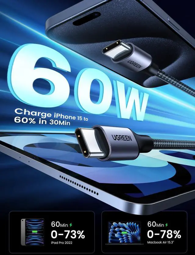 60W USB C Cable: Equipped with PD 3.0, this USB C cable can achieve 60W fast charging. When paired with a USB-C charger, it can charge MacBook Air from 0% to 78% in one hour. Backward compatible with 20W/30W/45W/65W chargers. Note: This is a USB-C to USB-C cable and must be paired with a USB-C charger to charge USB-C devices. It supports Charging and Data Transfer: Designed specifically for USB-C devices, this type-C cable can charge the Galaxy S24 from 0% to 60% in 30 minutes. This data cable can achieve a data transfer speed of 480Mbps and easily transfer music, movies and files Note: video output and monitor are not supported