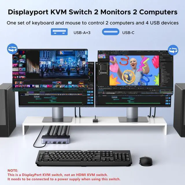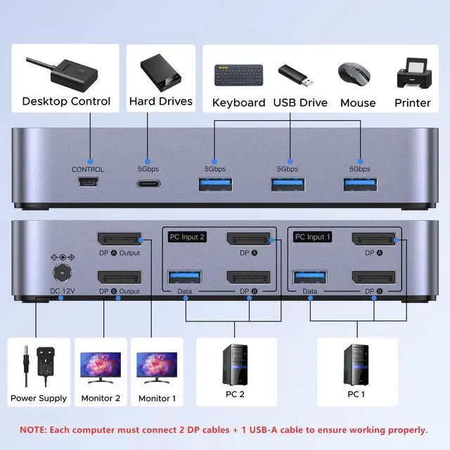 1, Please make sure each of your computers can support dual-screen displaying at the same time. Please make sure your computers have 2 DP ports+1 USB-A ports.