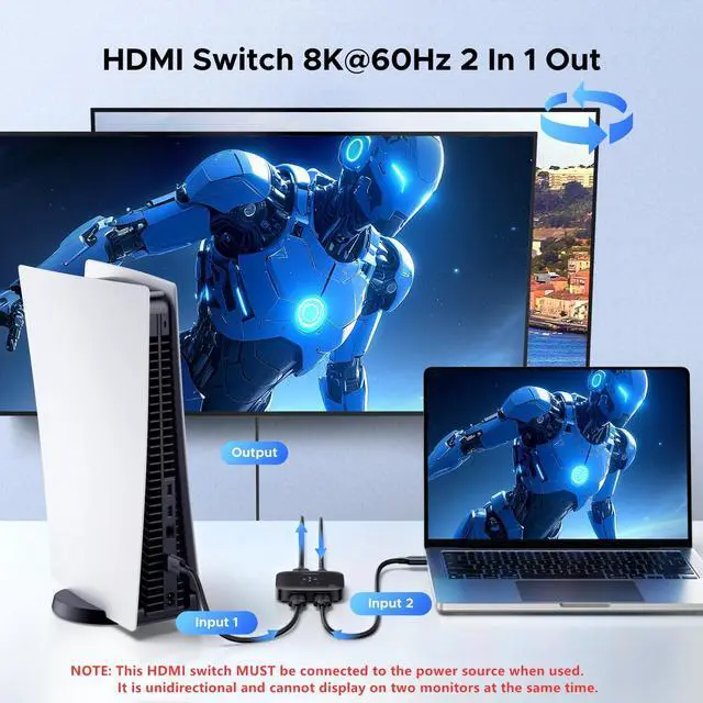 Note: 1, This HDMI 2.1 splitter MUST be connected to the power source when used. 2, Not support Switch Automatically. 3, Don't support ARC/eARC. 4, If want to achieve 8K@60Hz resolution, we recommend that you use a certified HDMI 2.1 cable that is less than 9.9ft AWG28. 5, Power Cable is Included, But HDMI cables and Power Adapter are NOT Included. 6, NOTE: It is unidirectional and does not support 1-in 2-out mode, so it cannot display on two monitors at the same time.