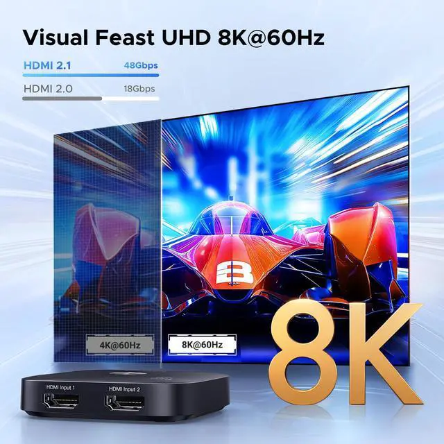 This HDMI 2.1 switch is perfect for gamers, supporting 8K@60Hz, 4K@240Hz, 4K@120Hz, and backward compatible with 1080P@240Hz resolutions. This HDMI splitter 2 in 1 out also supports HDMI 2.1/2.0/1.4, VRR, and Dynamic HDR, and Dolby Atmos & HDCP2.3. NOTE: To achieve the high-resolution 8K@60Hz, please make sure that your HDMI cables, monitor and graphics card all support 8K@60Hz.