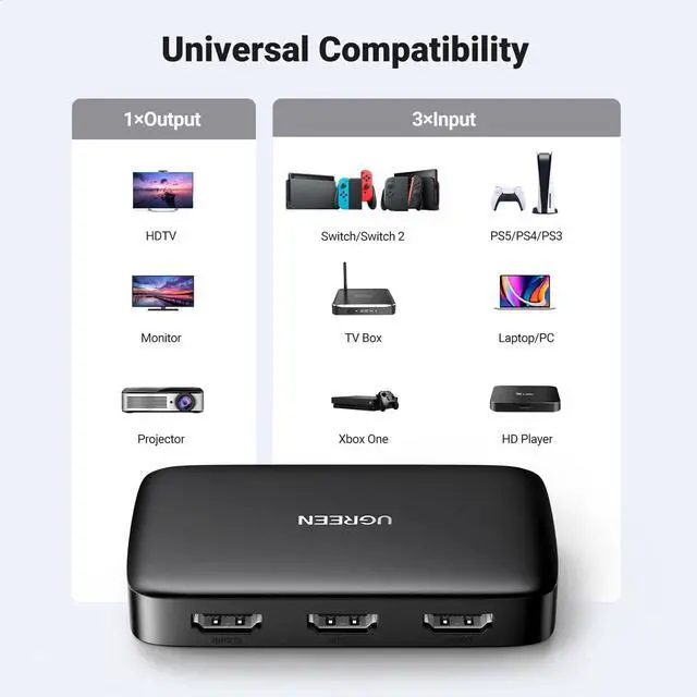 Merchant VideoIf you have too many HDMI devices(such as Roku, PS5/PS4/PS3, Xbox, etc) but want them to connect to a TV with very limited HDMI ports, UGREEN HDMI switch with remote is the ideal solution for you. This professional HDMI switch with 3 ports is suitable for the optimum video transmission of HDTV.