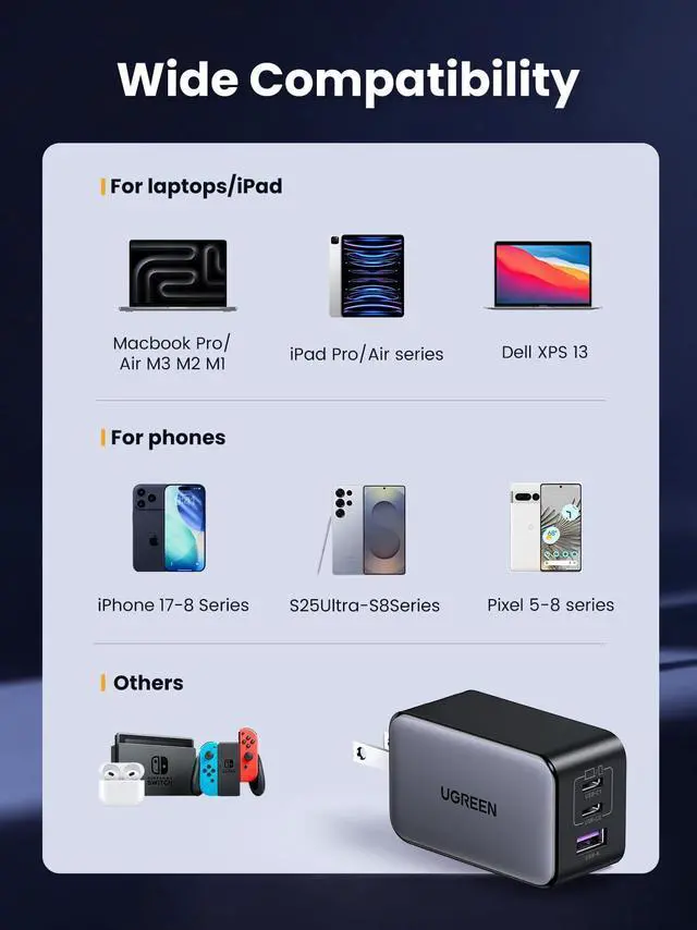 ![]() 65W 3-Port Charger | ![]() 65W 4-Port Charger | ![]() 65W 3-Port Charger | ![]() UGREEN Uno USB C Charger | ![]() 100W 4-Port Charger | ![]() 100W 5-Port Charger | ![]() 200W 4-Port Charger |