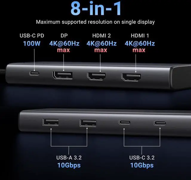 8 in 1 USB C Laptop Docking Station:Ugreen triple docking station equips with two 4K HDMI ports,a 4k Displayport, two 10 Gbps USB-C 3.2 Gen 2 ports, two 10 Gbps USB-A 3.2 Gen 2 ports, 100W Power Delivery