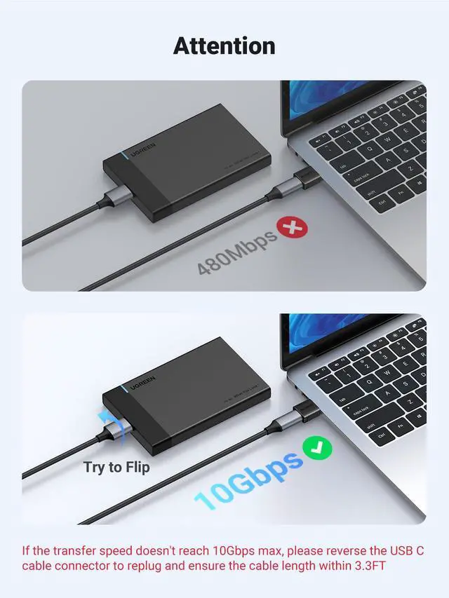 • Note: If the transfer speed doesn't reach 10Gbps max, please reverse the USB C cable connector to replug and ensure the cable length within 3.3FT