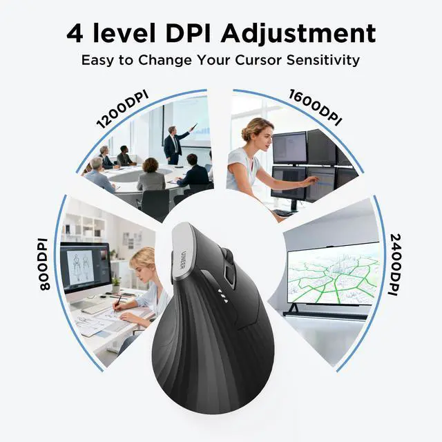 This wireless mouse has 4 levels of DPI adjustable: 800-2400DPI. It is recommended to use 800/1200 for browsing and 1600/2400 for precision. You can adjust the appropriate DPI by pressing the button below the scroll wheel