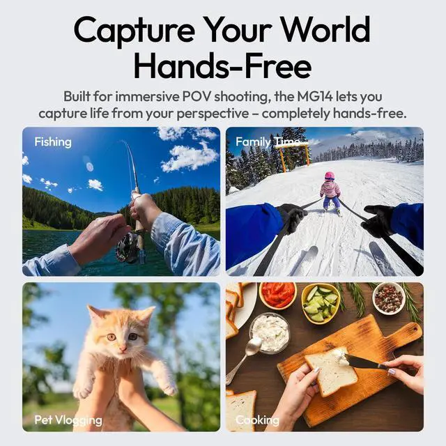 Capture Your World, Hands-Free: Built for immersive POV shooting, the MG14 lets you capture life from your perspective completely hands-free.