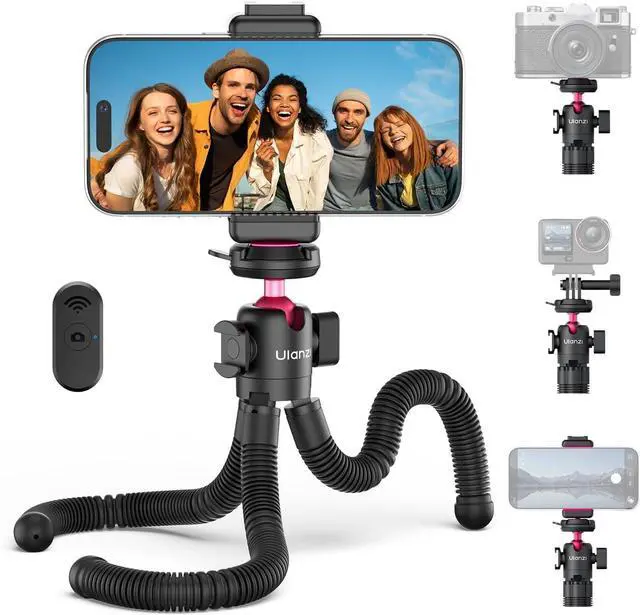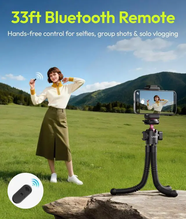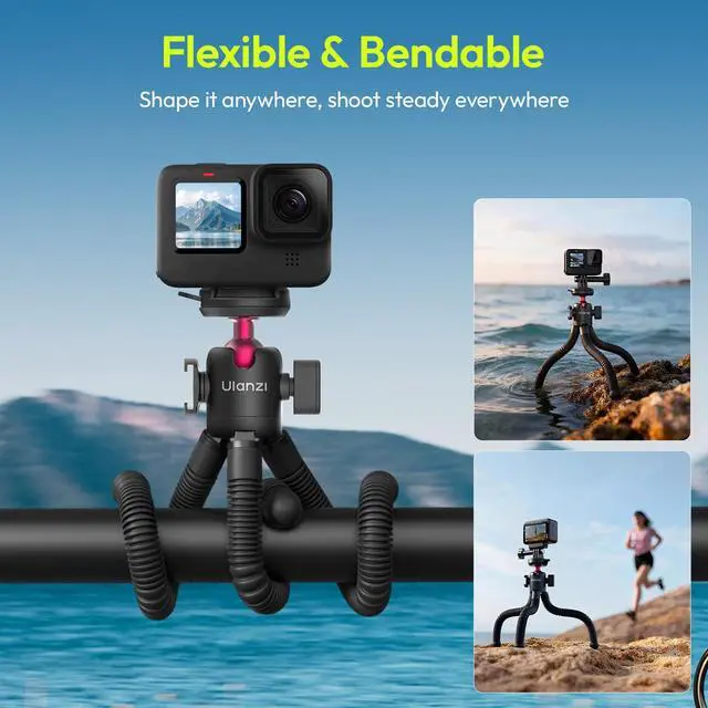 Flexible Octopus Legs & 360° Adjustable Angles: Durable silicone legs bend and grip securely on trees, poles, railings, bikes, or uneven surfaces. Place it on desks or the ground with ease. Enjoy 360° rotation and 90° tilt to capture low, high, or wide-angle shots effortlessly.