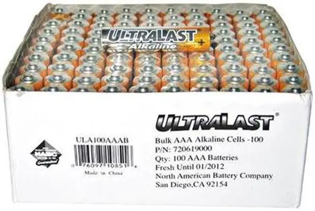 Ultralast ULA100AAAB ULA100AAAB Alkaline AAA Batteries, 100 pk1.5ALong-lasting850mAhNot rechargeableBoxedCompatible with Duracell(R) PC2400, Panasonic(R) AM4, Energizer(R) E92, Energizer(R) EN92, Golden Power HD-AAA, Golden Power 1212 & Golden Power UM4ULA100AAAB Alkaline AAA Batteries, 100 pk
