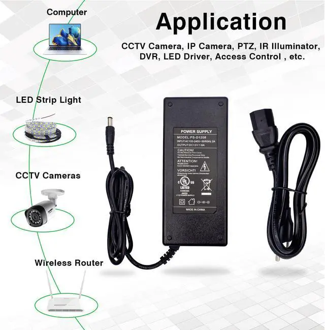 • Application: 12v power supply, LDE power supply. This surveillance camera power supply is suitable for CCTV security camera DVR, external hard drive, telescope motor, monitor, other 12 Vdc devices.