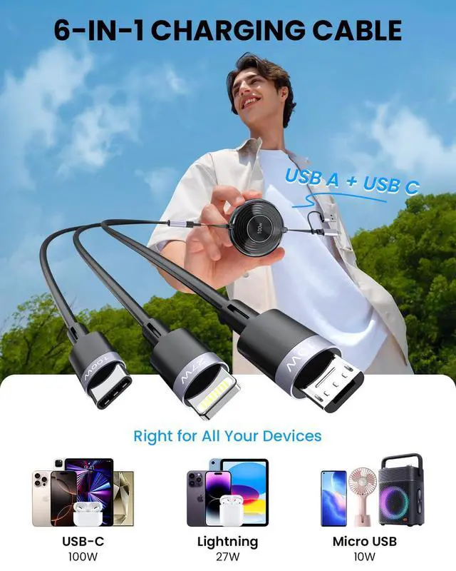 6-in-1 Multi Charging Cable - Charge All Your Devices with One Cable!Say goodbye to cable clutter! This cost-effective 6-in-1 charging cable is your ultimate solution for all charging needs. With 6 versatile port combinationsC to C (100W), C to Lightning (27W), C to Micro (10W), A to C, A to Lightning, and A to Microits perfect for Android, iPhone, and other devices. Switch effortlessly between Lightning, USB-C, and Micro USB ports. Whether at home, in the office, or on the go, this cable is ready to power up your life. Experience unmatched versatility and convenience!