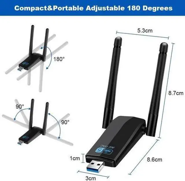 ??[DUAL HIGH-GAIN ANTENNAS]AXFEE Wifi dongle is equipped with two of 5dBi high-gain antennas, the angle of Wifi dongle is 180° adjustable, which can improve signal strength and keep wireless devices connected stably over a longer distance. With wider coverage, signal penetration, and anti-interference ability, it is very useful for large offices, homes and other places that need to cover a large area.