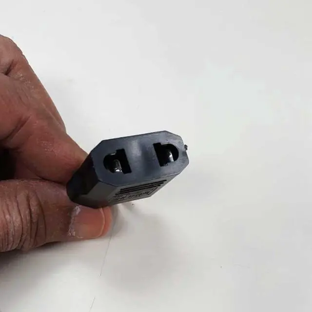 Converts 2 flat USA AC power plugs to 2 round-pin plugs for Euro use.