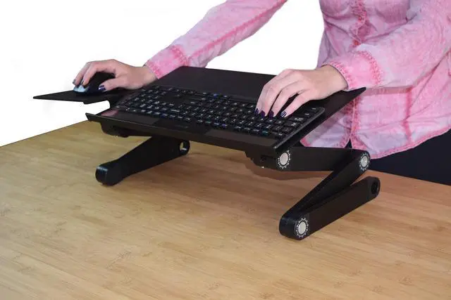 The lap desk for keyboard and mouse is lightweight, and adjustable. The lap keyboard and mouse tray slips over your legs and can safely rest beside you in bed.