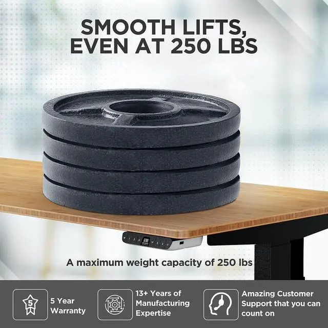 The dual motor standing desk frame lifts up to 250 lbs, safely moving virtually any office load. Upgrade your home office desk with an electric adjustable desk that's built to last. Our electric adjustable standing desk has been field tested since 2010 and comes with a 5 year warranty. The electric height adjustable desk is backed up with outstanding customer support that treats everyone like family. Our adjustable office desk comes with a beautiful bamboo desktop that securely mounts to the adjustable height standing desk frame. Whether you're looking for a small office desk, adjustable gaming desk, this motorized standing desk is perfect for you.