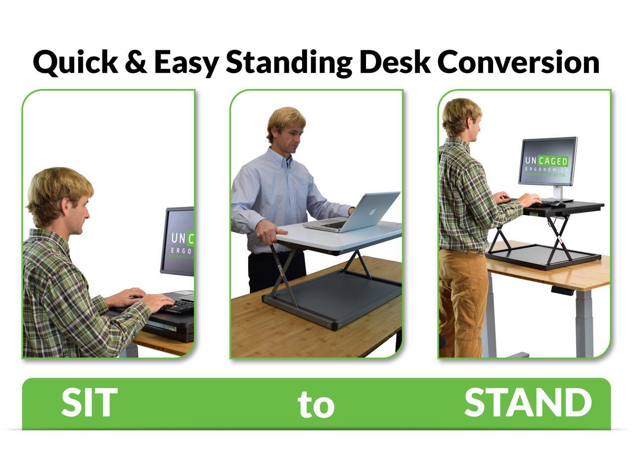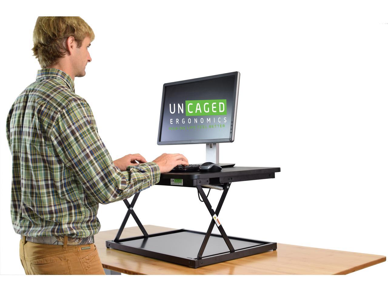 Compact Design - Uncaged Ergonomics adjustable desk riser for standing or sitting boasts a lightweight, simple, ergonomic design.