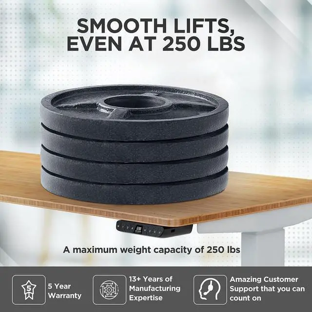 Beautiful electric, adjustable height standing desk featuring 2 best in class motors, memory keypad, precision laser-cut white steel frame and an elegant, solid bamboo desktop - 60"W x 30L.