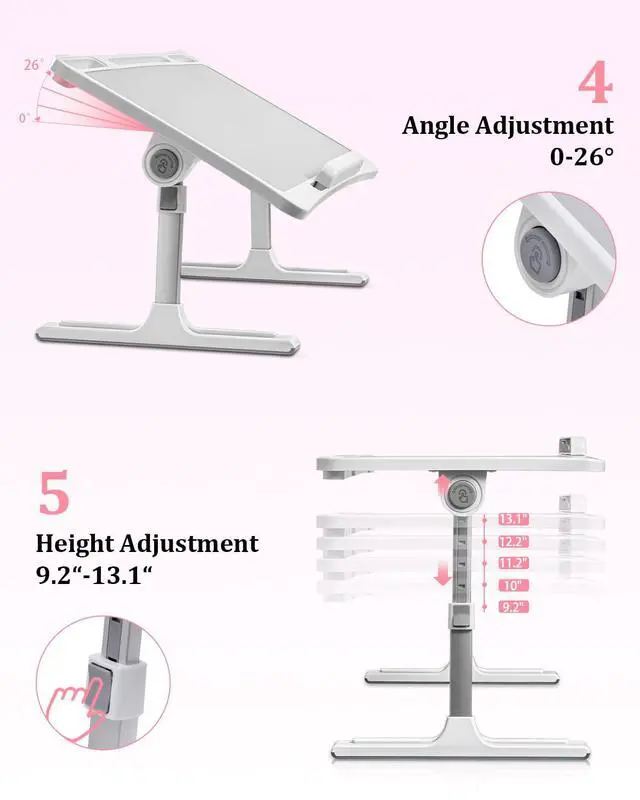 Adjustable Lap Desk: This adjustable bed desk is equipped with dual auto-lock buttons on both sides, enabling quick and effortless height adjustment. The desk legs offer 5 height settings, with an adjustable range from 9.2 inches to 13.1 inches. In addition, it comes with dual adjustment clips to modify the tilt angle of the desktop. The desktop supports 4 angle settings, with an adjustable range from 0°to 26°.
