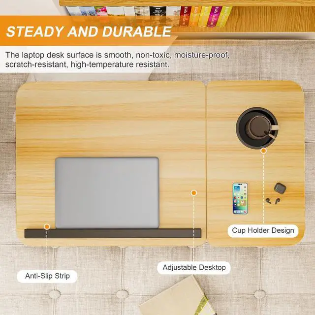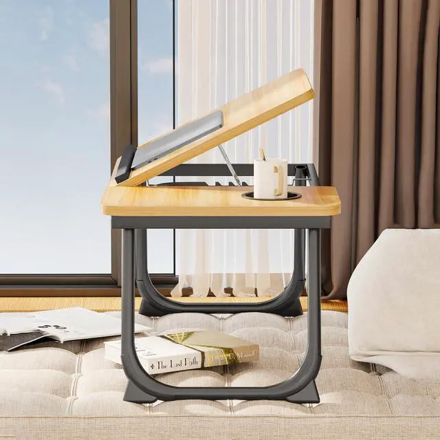 Merchant VideoMultifunction Laptop Desk: The laptop desk is equipped with adjustable tilting top, cup holder and a upgraded soft non-slip hand rest. The right side of the desktop is horizontal, so we can easily operate the mouse.